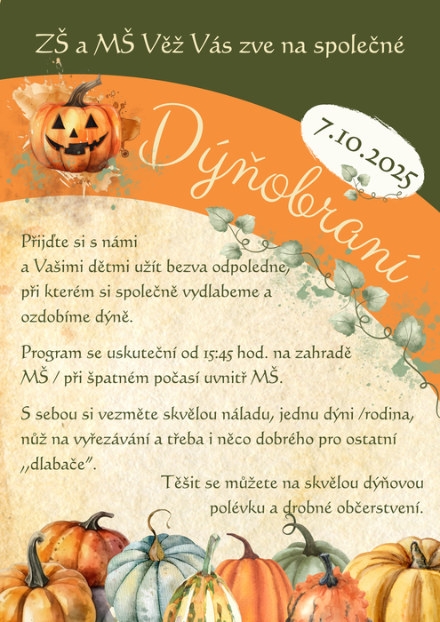ZŠ a MŠ Věž srdečně zve děti a žáky mateřské i základní školy, jejich rodiče a přátele školy na společnou podzimní akci Dýňobraní.