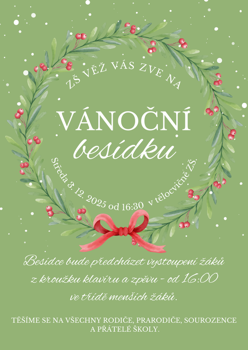 3.12. vystoupení žáků hudebních kroužků v 16.00 hodin ve třídě mladších žáků, následně Besídka pro rodiče a přátele školy od 16.30 hodin v tělocvičně